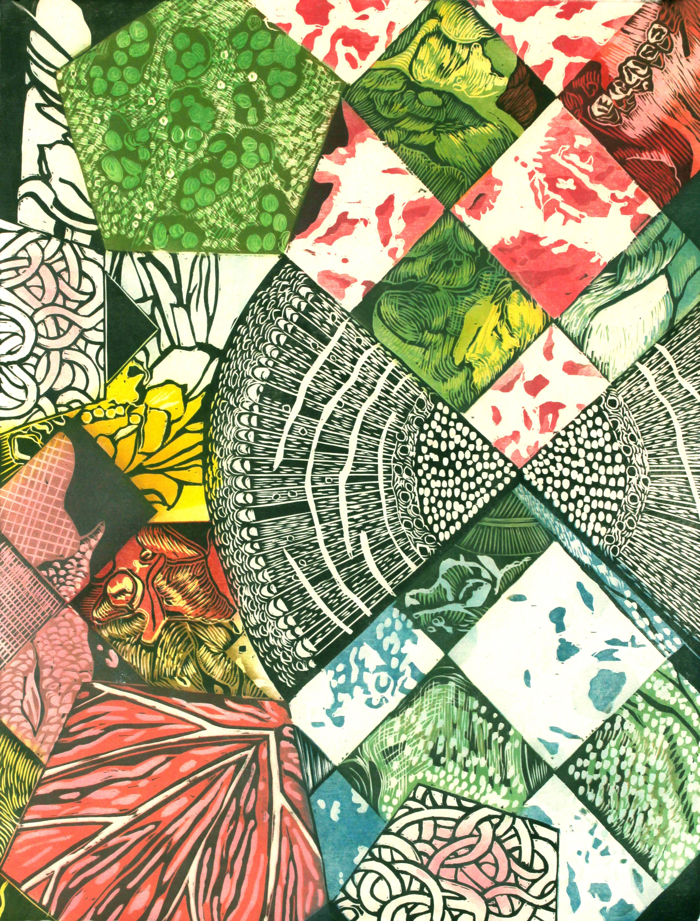 Surgery Quilt #1, reduction woodcut on Japanese paper, 22" x 17", 2019