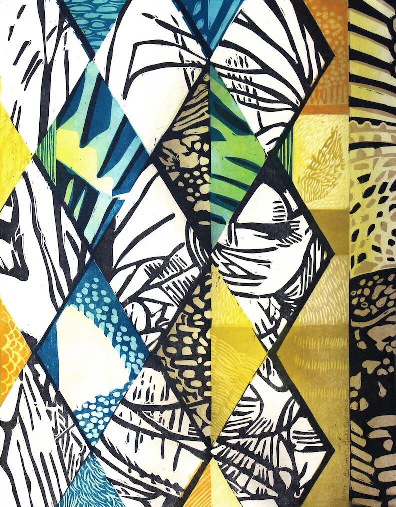Anne Burton is an artist living and working in Lincoln, Nebraska (USA). Her approach to color is intuitive and her approach to printmaking involves many layers of atmospheric color and pattern. Anne’s intricate and vivid work is created with woodcut, screenprint, intaglio, letterpress and pochoir printmaking techniques.